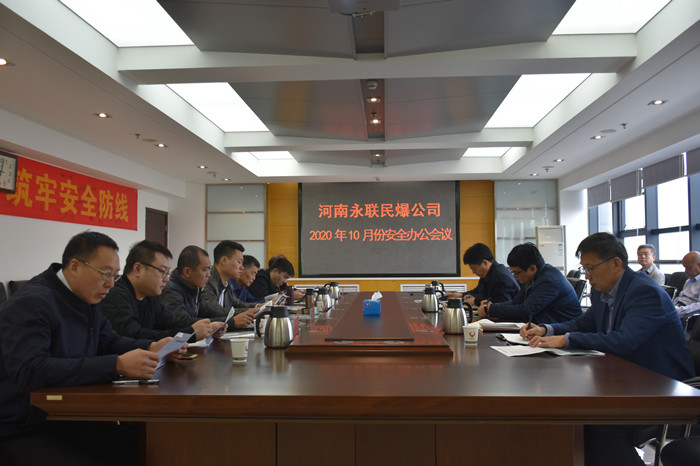 2020年10月30日,河南省永聯(lián)民爆器材股份有限公司召開了10月份安全辦公會議,公司領(lǐng)導班子、安委會成員、安委會辦公室成員以及確山縣、衛(wèi)輝市、永城、鎮(zhèn)平、郟縣、信陽等6家分公司負責人參加了會議。會議由公司副總經(jīng)理靳義國主持,公司董事長、總經(jīng)理劉嵩參加會議并講話。