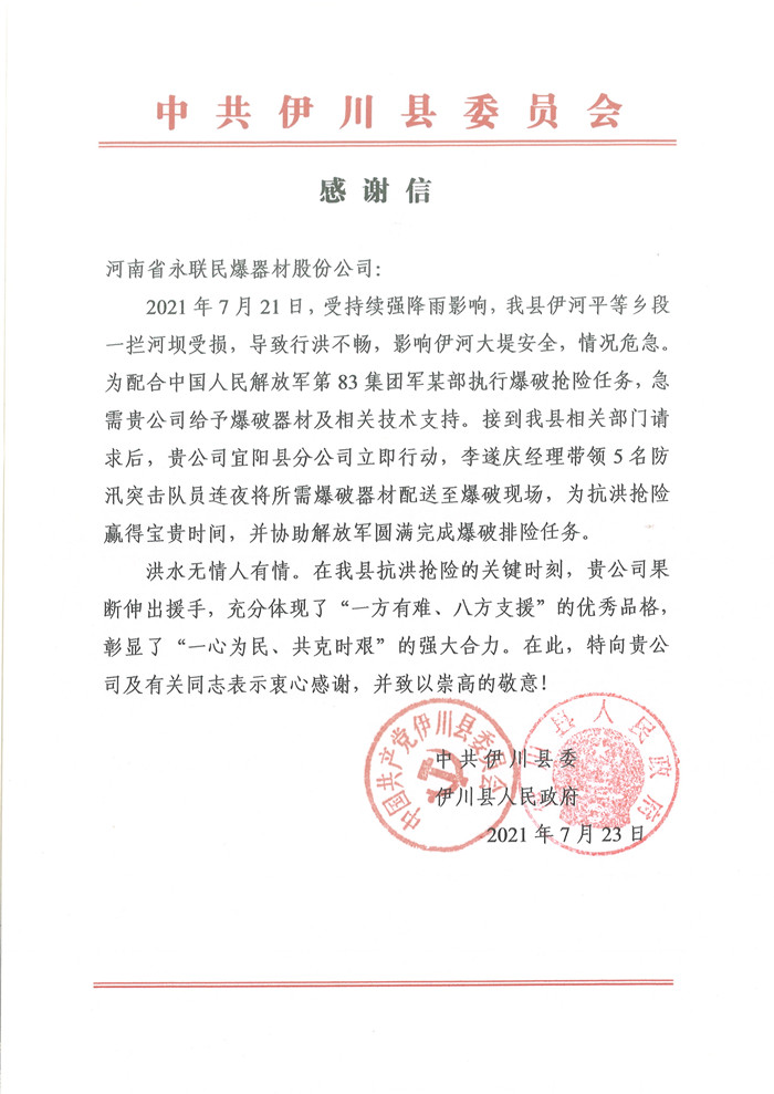 7月19-22日,河南省多地持續遭遇極端強降雨天氣,造成重大人員傷亡和財產損失。20日,洛陽市伊川縣境內伊何灘攔水壩出現約20米決口,河堤受損嚴重,攔水壩隨時可能垮塌。危難當頭,宜陽縣分公司臨危受命,不畏艱險、迎難而上,圓滿完成了爆破搶險任務。7月23日,公司收到了中共伊川縣委、伊川縣人民政府發來的一封感謝信,高度贊揚宜陽縣分公司對伊川縣伊河平等鄉段一攔河壩爆破搶險任務所做出的貢獻,感謝宜陽縣分公司在危難關頭無私無畏,全力以赴協助第83集團軍某部完成爆破排險,確保人民群眾的生命財產安全。