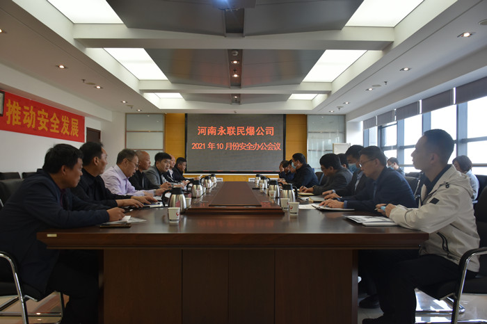 2021年10月27日,河南省永聯民爆器材股份有限公司召開了10月份安全辦公會議,公司領導班子成員、監事會成員、安委會成員、安委會辦公室成員以及嵩縣、衛輝市、登封市、安陽市、駐馬店市、輝縣市等6家分公司負責人參加了會議。會議由公司副總經理靳義國主持,公司董事長、總經理劉嵩參加會議并講話,監事會主席閆運鋒、副董事長李豫昆參加會議。