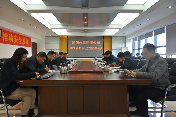 2021年11月26日,河南省永聯民爆器材股份有限公司召開了11月份安全辦公會議,公司領導班子、安委會成員、安委會辦公室成員以及欒川縣、平頂山力源、方城縣、內鄉縣、鎮平、固始縣等6家分公司負責人參加了會議。會議由公司副總經理靳義國主持,公司董事長、總經理劉嵩參加會議并講話。