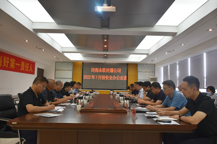 2022年8月2日,河南省永聯民爆器材股份有限公司召開了7月份安全辦公會議,公司領導班子、安委會成員、安委會辦公室成員以及固始縣、舞鋼市、桐柏、衛輝市、嵩縣、登封市、靈寶市等7家分公司負責人參加了會議。會議由公司副總經理靳義國主持,公司董事長、總經理劉嵩參加會議并講話。