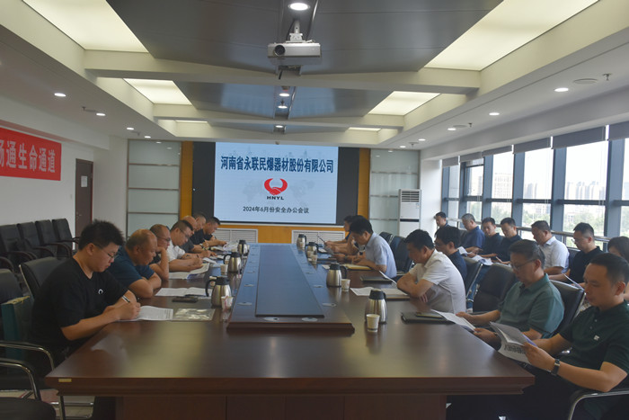 2024年6月27日,河南省永聯民爆器材股份有限公司召開了6月份安全辦公會議,公司領導班子、安委會成員、安委會辦公室成員以及洛寧縣、方城縣、信陽、郟縣、澠池縣、永城等6家分公司負責人參加了會議。會議由公司副總經理靳義國主持,公司董事長、總經理劉嵩參加會議并講話。
